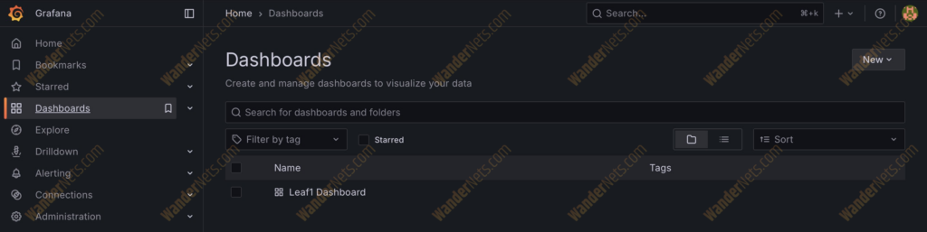 To access Grafana, go to http://localhost:3000/. In the Dashboards section, you’ll see the Leaf1 Dashboard. It’s already pre-provisioned with charts showing different metrics.