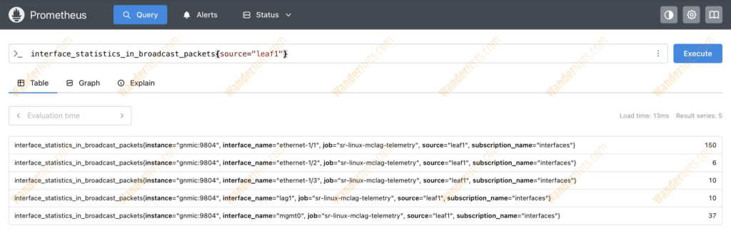 We can even query Prometheus for data. Let’s check how many broadcast packets are on the counters on the interfaces on Leaf1. The query to collect data is as follows: